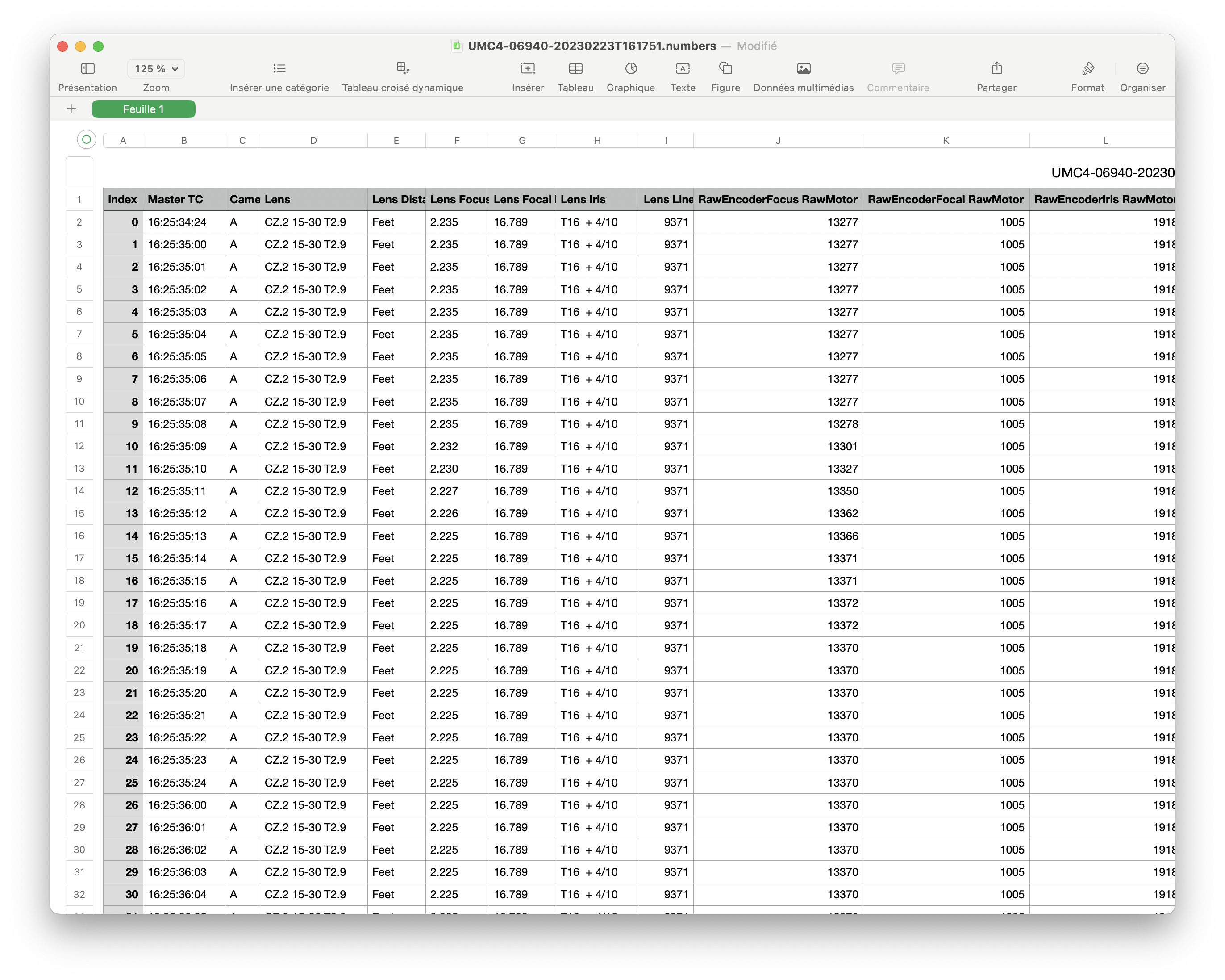 Once our computer is connected via wifi to the Lockit+ box, the data are displayed, enabling us to record each shot and all the metadata transmitted by the optics. The data are recorded by the box in a text file is in YAML format (between XML and CSV), as plain text (open source), but it’s raw data. We’ll then need to find the software that can parse this data and merge it with the metadata of an image file, based on the timecode and on the classic data describing the shot (name, date, band number, etc.).