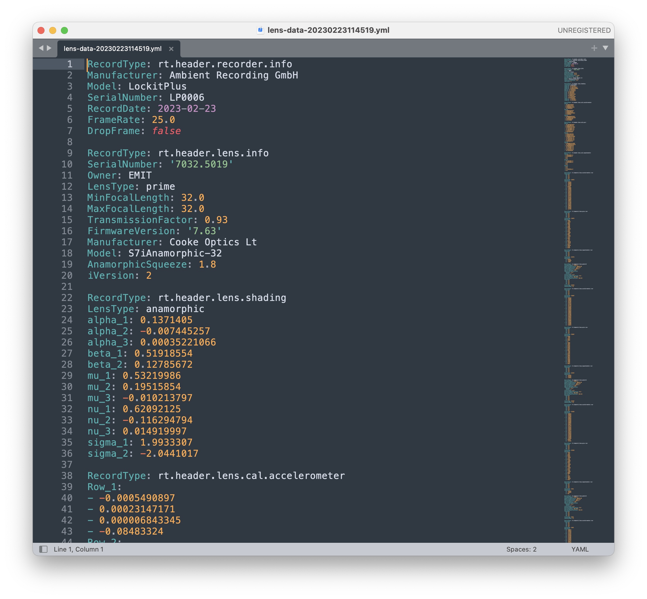 A word of clarification, however: the latest version of Lockit+ only integrates Cooke’s /i3 extended metadata recording. There was talk of Zeiss compatibility in the future, but no certainty yet. Thanks to Yannic Hieber @ambient.de, who kindly entrusted us with a prototype for our work. This enabled us to record raw data from Cooke lenses with synchronized timecode on SD card in YAML format. For Zeiss configurations, the box simply injected the timecode into the camera and into the electronic slate that was framed. We then had to rely on the cameras’ ability to record metadata via the PL mount.